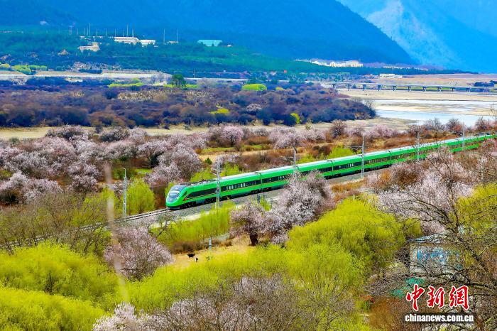 2025年西藏林芝桃花盛开时节,高原复兴号奔驰于拉林铁路上。马生明 摄