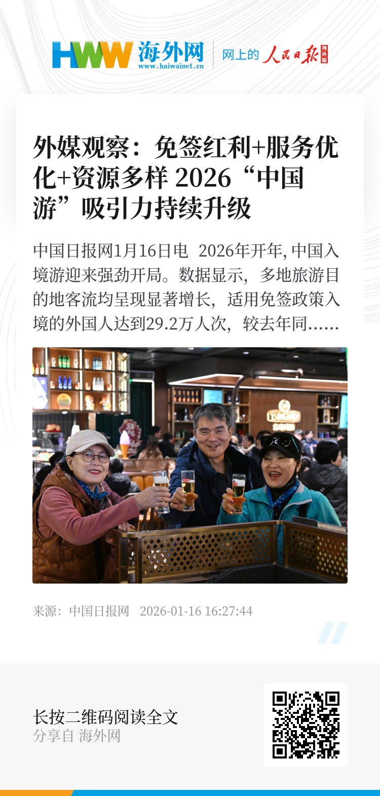 中国日报网1月16日电 2026年开年,中国入境游迎来强劲开局。数据显示,多地旅游目的地客流均呈现显著增长,适用免签政策入境的外国人达到29.2万人次,较去年同期增长35.8%。国际旅游行业媒体《旅行与旅游世界》网站(Travel And Tour World)持续关注中国蓬勃发展的旅游市场并在近日的报道中表示,在免签政策红利加持与国际连通性不断提升的双重推动下,中国的旅游格局正经历深刻转型,这一上升趋势亦凸显出中国作为全球旅游目的地的吸引力日益增强。