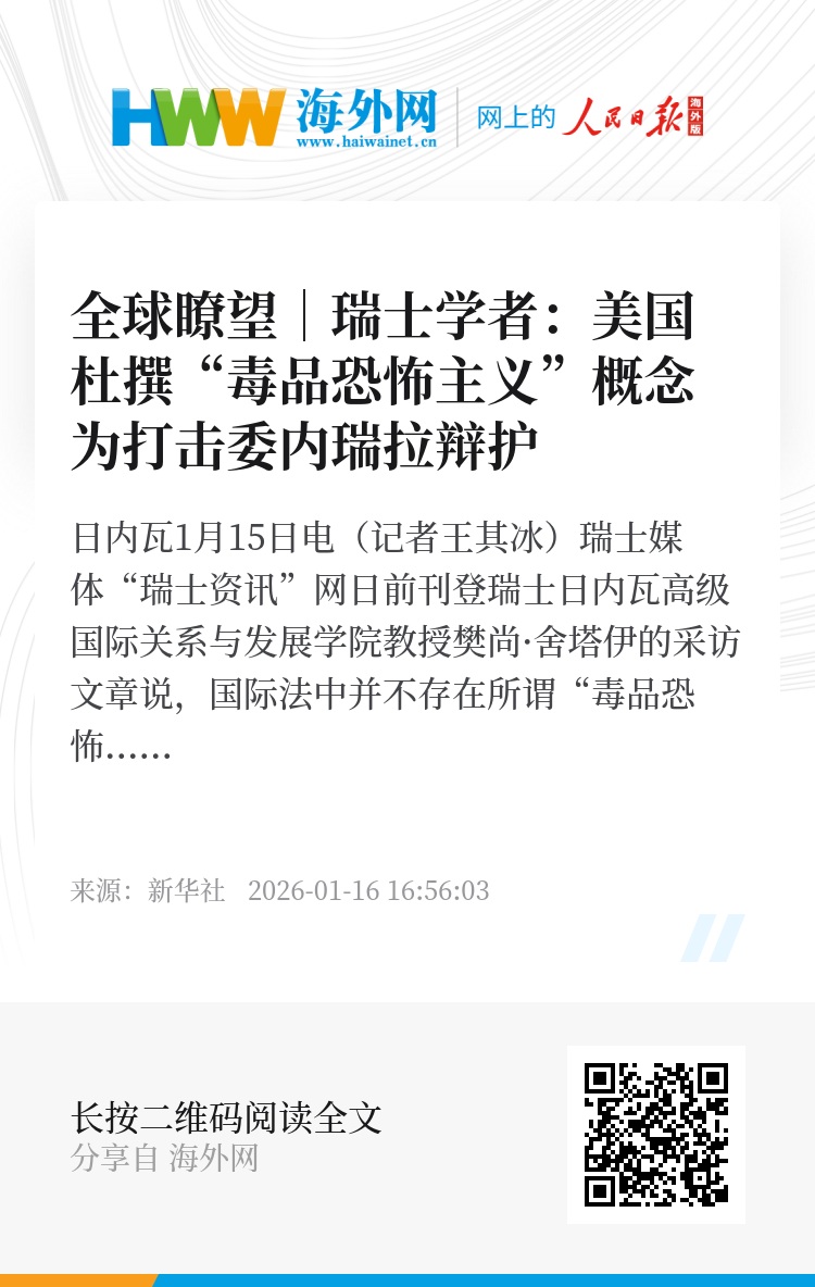 新华社日内瓦1月15日电(记者王其冰)瑞士媒体“瑞士资讯”网日前刊登瑞士日内瓦高级国际关系与发展学院教授樊尚·舍塔伊的采访文章说,国际法中并不存在所谓“毒品恐怖主义”,美国以此为由对委内瑞拉发起军事行动、强行控制委总统马杜罗及其夫人并把他们带到美国的行径是“违反《联合国宪章》和国际习惯法的武装侵略行为”。文章摘要如下: