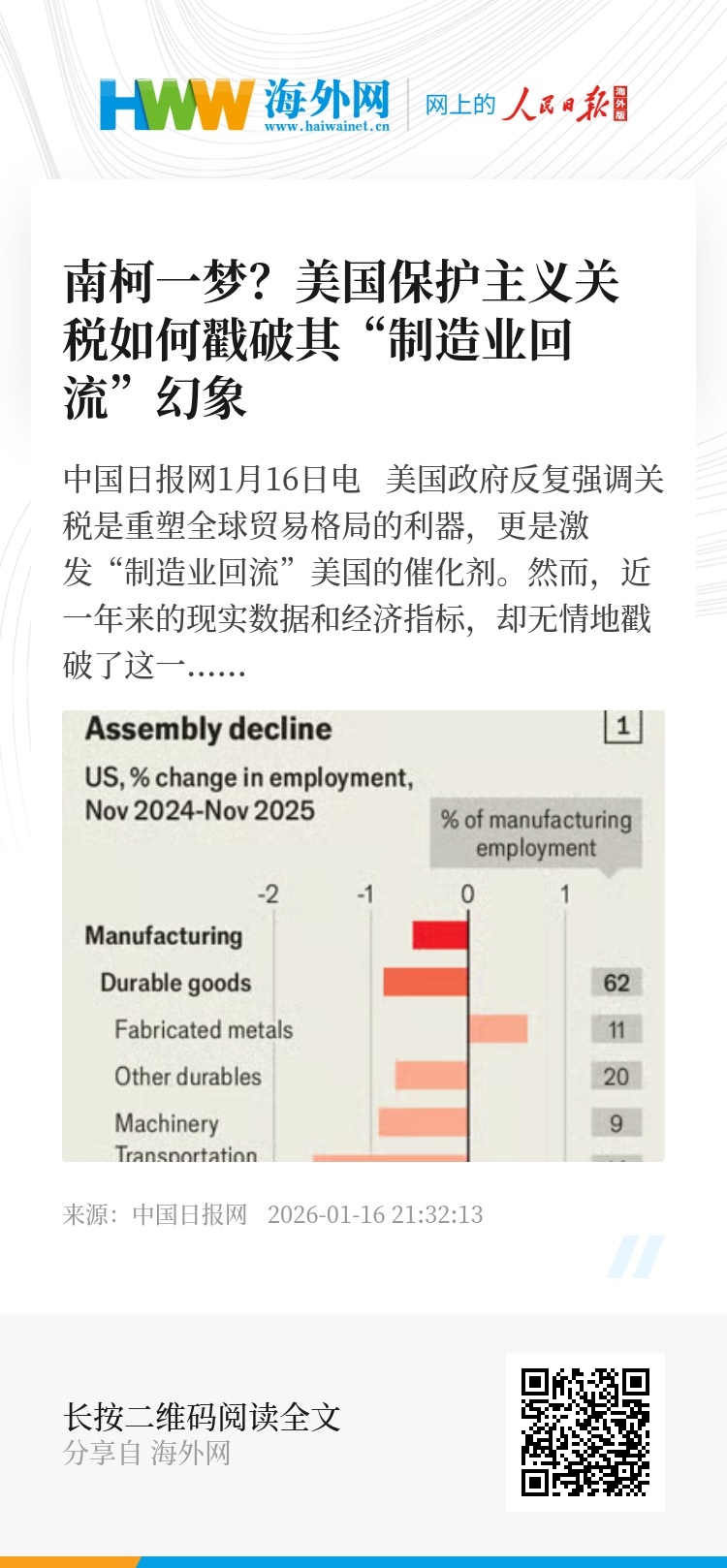 中国日报网1月16日电 美国政府反复强调关税是重塑全球贸易格局的利器,更是激发“制造业回流”美国的催化剂。然而,近一年来的现实数据和经济指标,却无情地戳破了这一美好愿景。