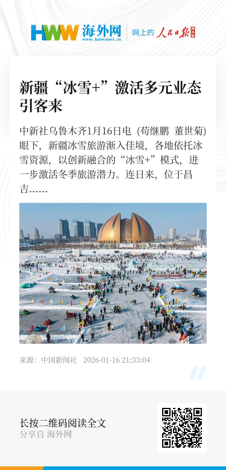 中新社乌鲁木齐1月16日电 (苟继鹏 董世菊)眼下,新疆冰雪旅游渐入佳境,各地依托冰雪资源,以创新融合的“冰雪+”模式,进一步激活冬季旅游潜力。