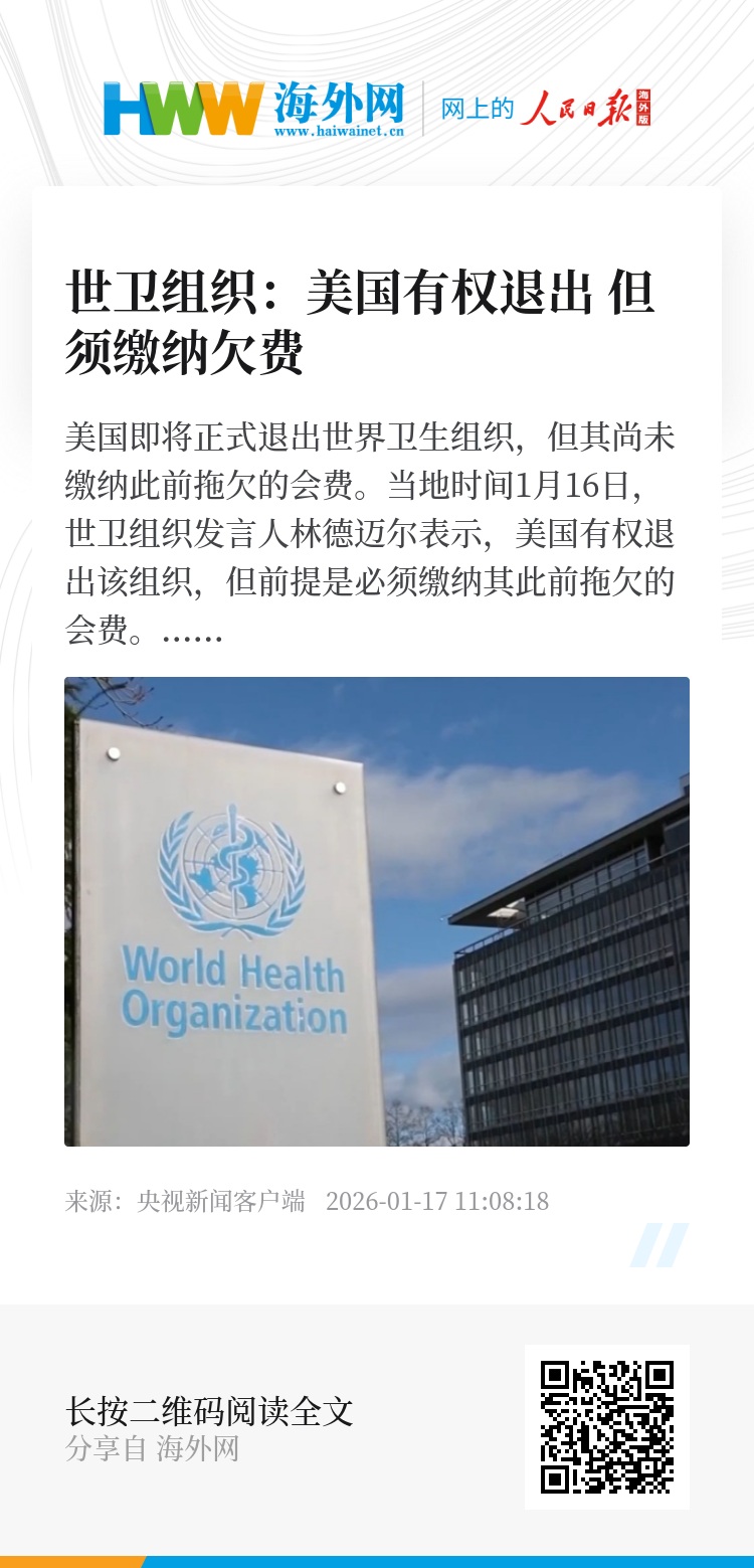 美国即将正式退出世界卫生组织,但其尚未缴纳此前拖欠的会费。当地时间1月16日,世卫组织发言人林德迈尔表示,美国有权退出该组织,但前提是必须缴纳其此前拖欠的会费。林德迈尔表示,此事已列入即将召开的世卫组织执行委员会会议议程,世卫组织秘书处将根据执行委员会的建议采取相应行动。林德迈尔称,美国目前尚未支付2024年度和2025年度的会费。根据世卫组织预算,美国2024年度和2025年度的应缴会费总额约为2.6亿美元。