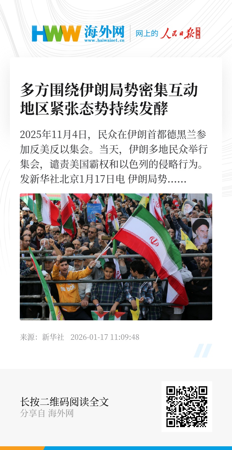 新华社北京1月17日电 伊朗局势近日牵动多方神经,美国和以色列密集开展高层沟通与情报磋商,伊朗则与俄罗斯深化协调,同时欧盟发布航空安全警示,地区紧张态势持续升级。