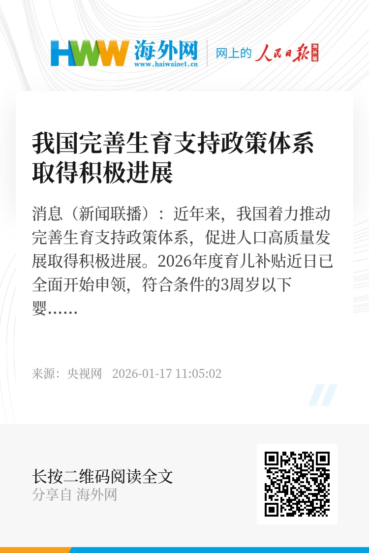 央视网消息(新闻联播):近年来,我国着力推动完善生育支持政策体系,促进人口高质量发展取得积极进展。