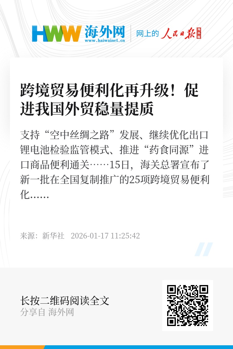 支持“空中丝绸之路”发展、继续优化出口锂电池检验监管模式、推进“药食同源”进口商品便利通关……15日,海关总署宣布了新一批在全国复制推广的25项跨境贸易便利化措施,为促进我国外贸稳量提质、打造对外开放新优势释放更强动能。