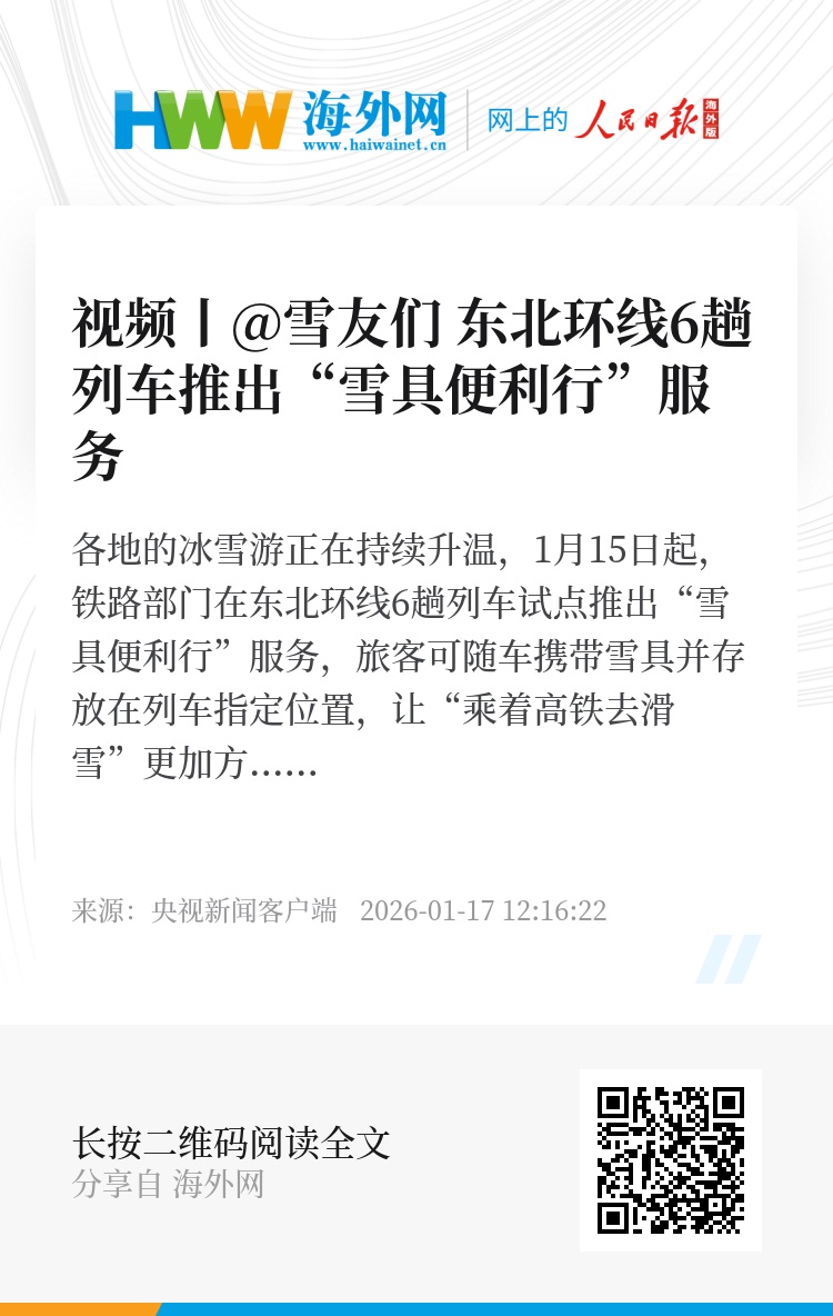 各地的冰雪游正在持续升温,1月15日起,铁路部门在东北环线6趟列车试点推出“雪具便利行”服务,旅客可随车携带雪具并存放在列车指定位置,让“乘着高铁去滑雪”更加方便快捷。