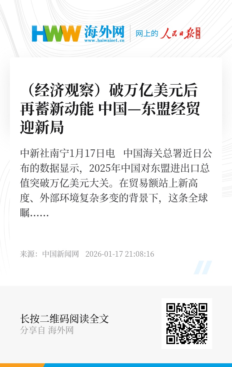 中新社南宁1月17日电 中国海关总署近日公布的数据显示,2025年中国对东盟进出口总值突破万亿美元大关。在贸易额站上新高度、外部环境复杂多变的背景下,这条全球瞩目的经济纽带前景如何?多位专家学者在接受中新社记者采访时指出,中国—东盟经贸合作内生动力强劲,正孕育新一轮增长。