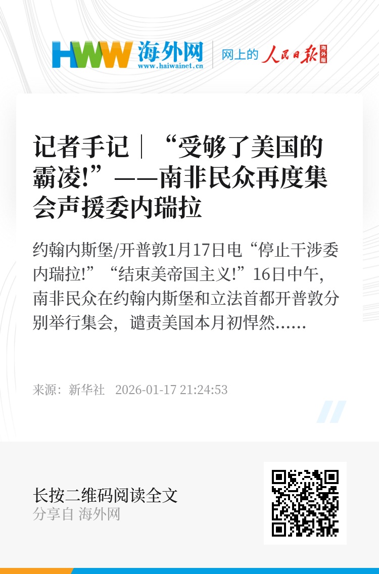 在开普敦,集会民众同样表达了对美国霸权行径的强烈愤慨。活动发起者之一、开普敦大学学生法里克·锡巴说,美国对委内瑞拉的军事行动违反国际法,她担心任何国家都有可能成为美国的下一个目标。