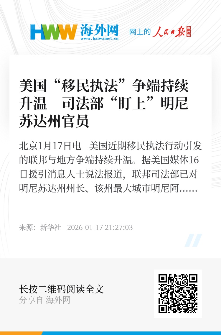 新华社北京1月17日电 美国近期移民执法行动引发的联邦与地方争端持续升温。据美国媒体16日援引消息人士说法报道,联邦司法部已对明尼苏达州州长、该州最大城市明尼阿波利斯市长等官员启动刑事调查。按知情人士说法,这些民主党籍官员涉嫌妨碍移民执法人员执行公务。