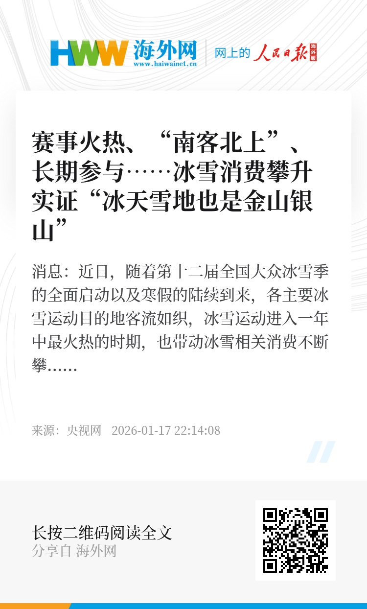 央视网消息:近日,随着第十二届全国大众冰雪季的全面启动以及寒假的陆续到来,各主要冰雪运动目的地客流如织,冰雪运动进入一年中最火热的时期,也带动冰雪相关消费不断攀升。