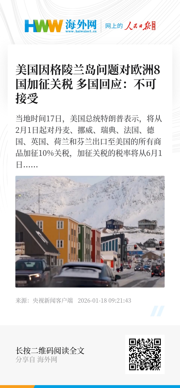 当地时间17日,美国总统特朗普表示,将从2月1日起对丹麦、挪威、瑞典、法国、德国、英国、荷兰和芬兰出口至美国的所有商品加征10%关税,加征关税的税率将从6月1日起提高至25%,直至就“完全、彻底购买格陵兰岛”达成协议。随后,多国发表声明回应。