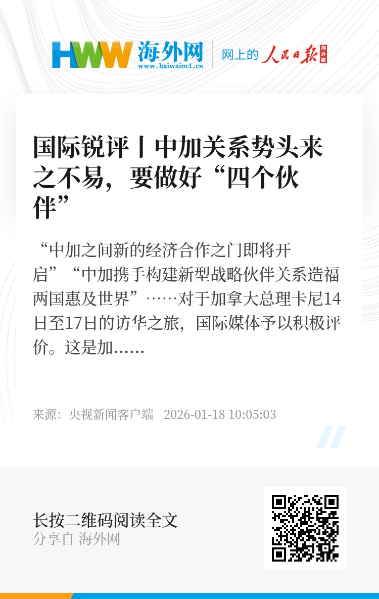 这样的势头来之不易。回顾过去,中加自1970年建交以来,双边关系曾长期走在中国同西方国家的前列。然而,前些年由于加拿大时任政府的某些不理性行为,双边关系一度趋于紧张。2025年卡尼就任加拿大总理以来,加新政府提出推进加中战略伙伴关系,推动加中关系取得更多成果。2025年10月,习近平主席在韩国庆州会见卡尼总理并达成重要共识,标志着两国关系实现转圜。短短几个月后,卡尼即展开就任以来首次访华。分析人士指出,当前加方对华外交展现出独立自主、理性务实的一面,卡尼总理此次访华成果以及中加关系改善势头将给变乱交织的世界带来更多正能量。