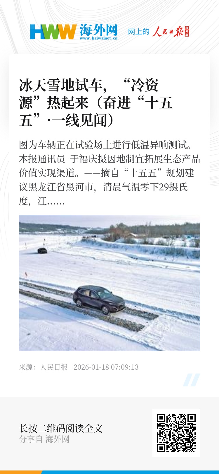 黑河街头,贴着特殊车膜的测试车是一道风景。“十五五”时期,当地产业发展的路径更加清晰:完善智慧测试园区配套、实现测试周期全季覆盖、推动智能网联和自动驾驶测试设施建设、进一步丰富极端环境测试场景……冰天雪地中,发展新机不断萌发。(本报记者 郭晓龙 本报通讯员 于福庆)