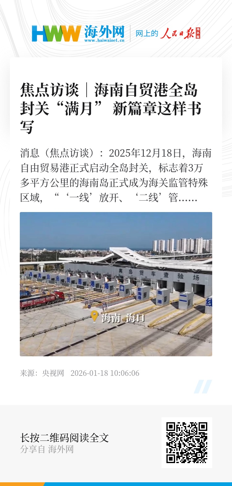 央视网消息(焦点访谈):2025年12月18日,海南自由贸易港正式启动全岛封关,标志着3万多平方公里的海南岛正式成为海关监管特殊区域,“‘一线’放开、‘二线’管住、岛内自由”的新篇章就此开启。全岛封关,是海南自由贸易港建设乃至中国对外开放进程中的一件大事。如今,封关运作一个月,运行情况如何?政策红利有没有得到精准释放?市场主体能够得到哪些实惠?产业发展、消费场景又呈现出哪些新变化?我们跟随记者的镜头去看看。