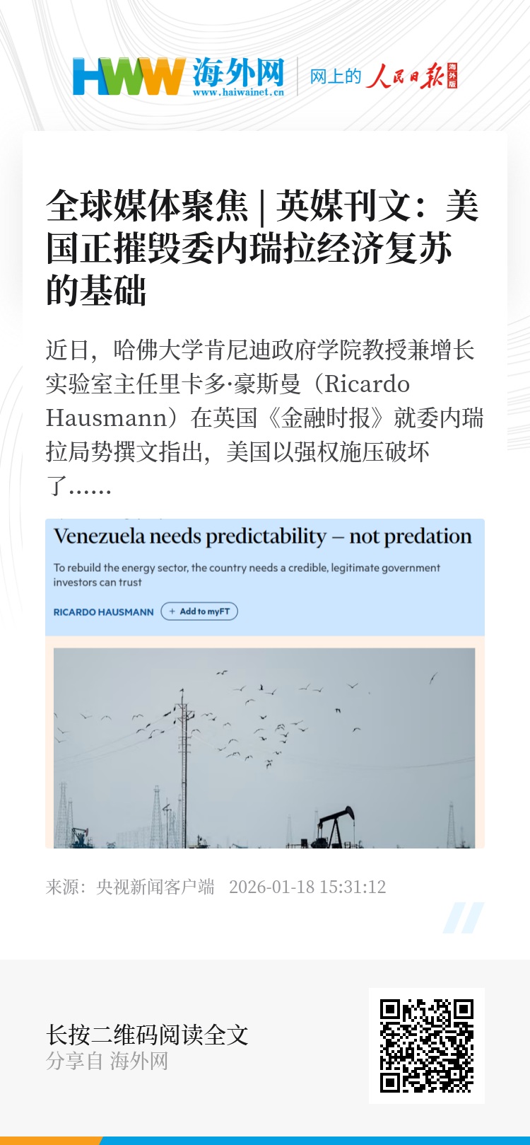 近日,哈佛大学肯尼迪政府学院教授兼增长实验室主任里卡多·豪斯曼(Ricardo Hausmann)在英国《金融时报》就委内瑞拉局势撰文指出,美国以强权施压破坏了他国吸引投资所需的法治环境与政治信任。不仅无法实现重建和发展,还会损害美国自身的战略信誉。