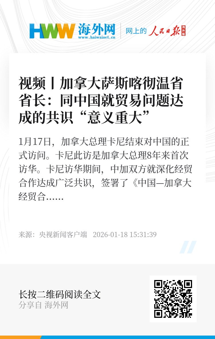 对此,随同总理卡尼访华的加拿大萨斯喀彻温省省长斯科特·莫伊在接受媒体采访时表示,加中双方达成的共识意义重大。