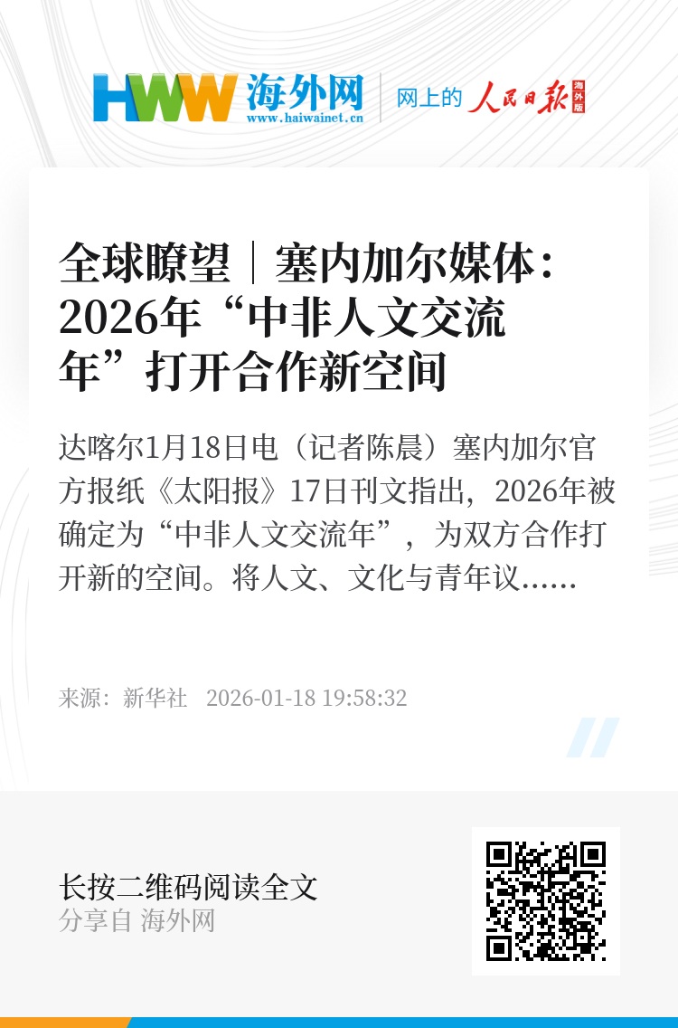 新华社达喀尔1月18日电(记者陈晨)塞内加尔官方报纸《太阳报》17日刊文指出,2026年被确定为“中非人文交流年”,为双方合作打开新的空间。将人文、文化与青年议题置于更突出位置,有助于推动合作朝着更可持续、也更易获得社会认同的方向发展。文章摘要如下: