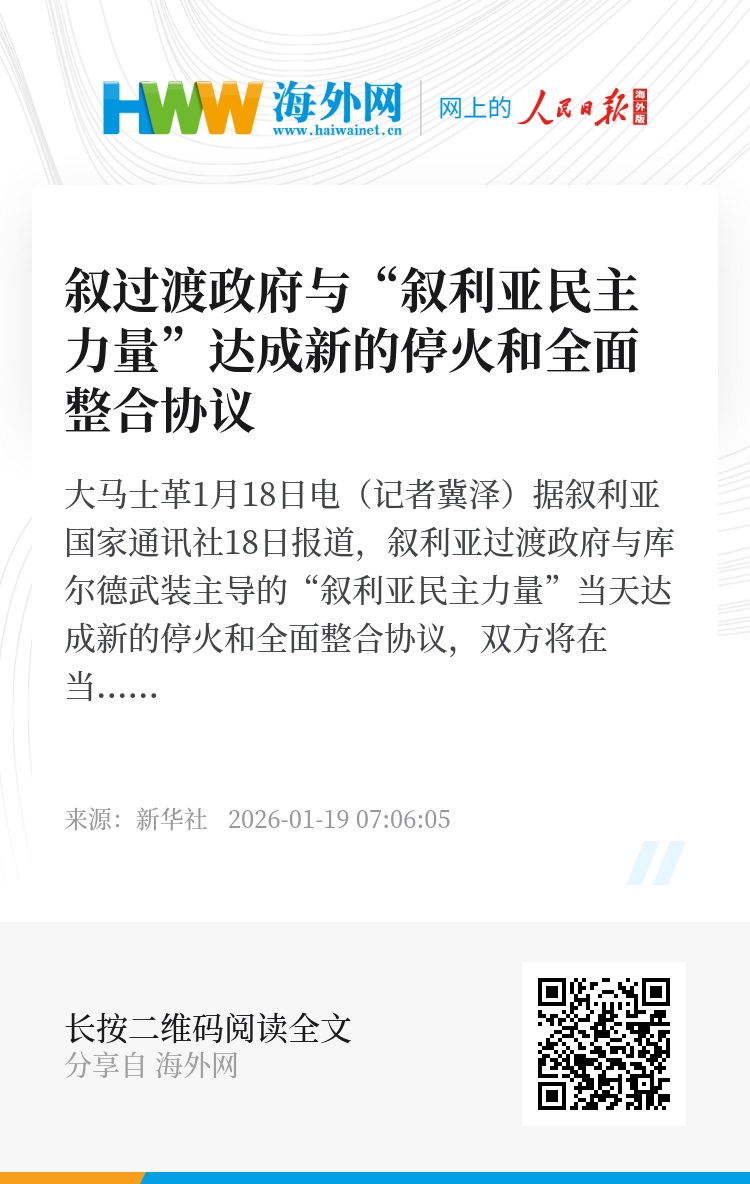 新华社大马士革1月18日电(记者冀泽)据叙利亚国家通讯社18日报道,叙利亚过渡政府与库尔德武装主导的“叙利亚民主力量”当天达成新的停火和全面整合协议,双方将在当前所有战线和接触点立即全面停火。