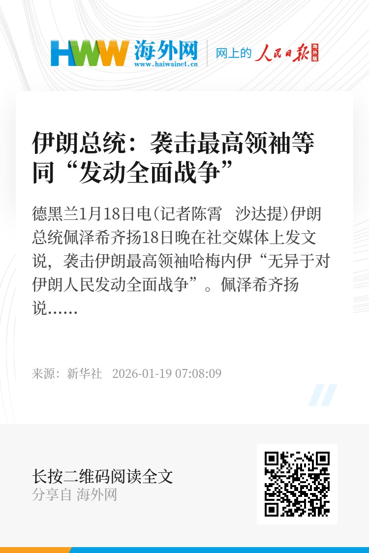 新华社德黑兰1月18日电(记者陈霄 沙达提)伊朗总统佩泽希齐扬18日晚在社交媒体上发文说,袭击伊朗最高领袖哈梅内伊“无异于对伊朗人民发动全面战争”。