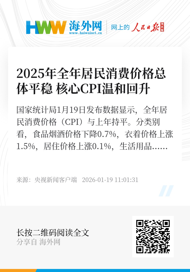 国家统计局1月19日发布数据显示,全年居民消费价格(CPI)与上年持平。