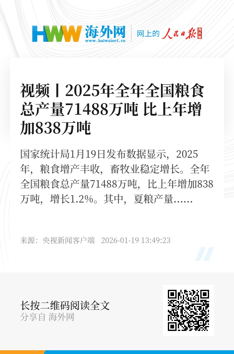 国家统计局1月19日发布数据显示,2025年,粮食增产丰收,畜牧业稳定增长。
