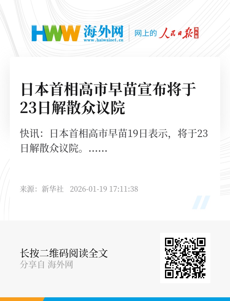 新华社快讯:日本首相高市早苗19日表示,将于23日解散众议院。
