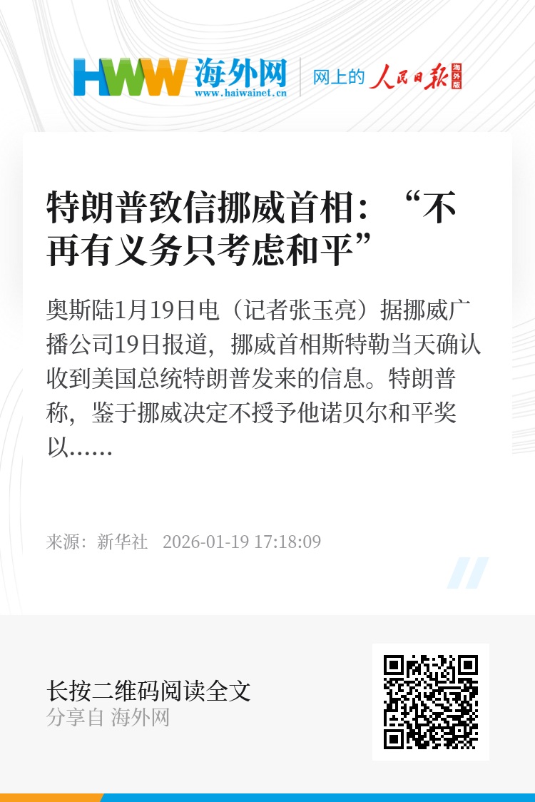新华社奥斯陆1月19日电(记者张玉亮)据挪威广播公司19日报道,挪威首相斯特勒当天确认收到美国总统特朗普发来的信息。特朗普称,鉴于挪威决定不授予他诺贝尔和平奖以表彰他阻止了“8场战争”,“我觉得不再有义务只考虑和平……现在我可以考虑对美国来说什么是有利和恰当的”。