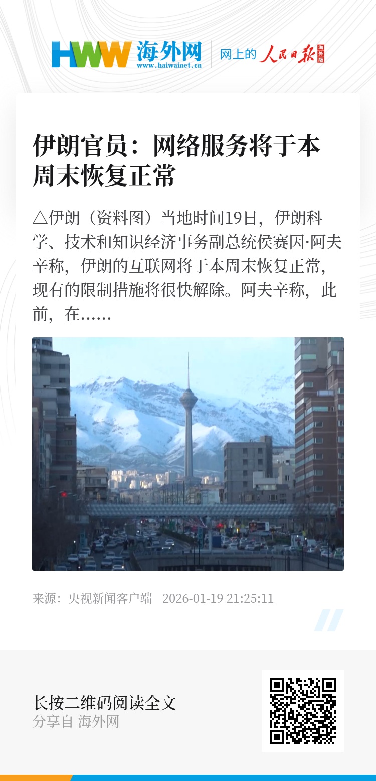 当地时间19日,伊朗科学、技术和知识经济事务副总统侯赛因·阿夫辛称,伊朗的互联网将于本周末恢复正常,现有的限制措施将很快解除。