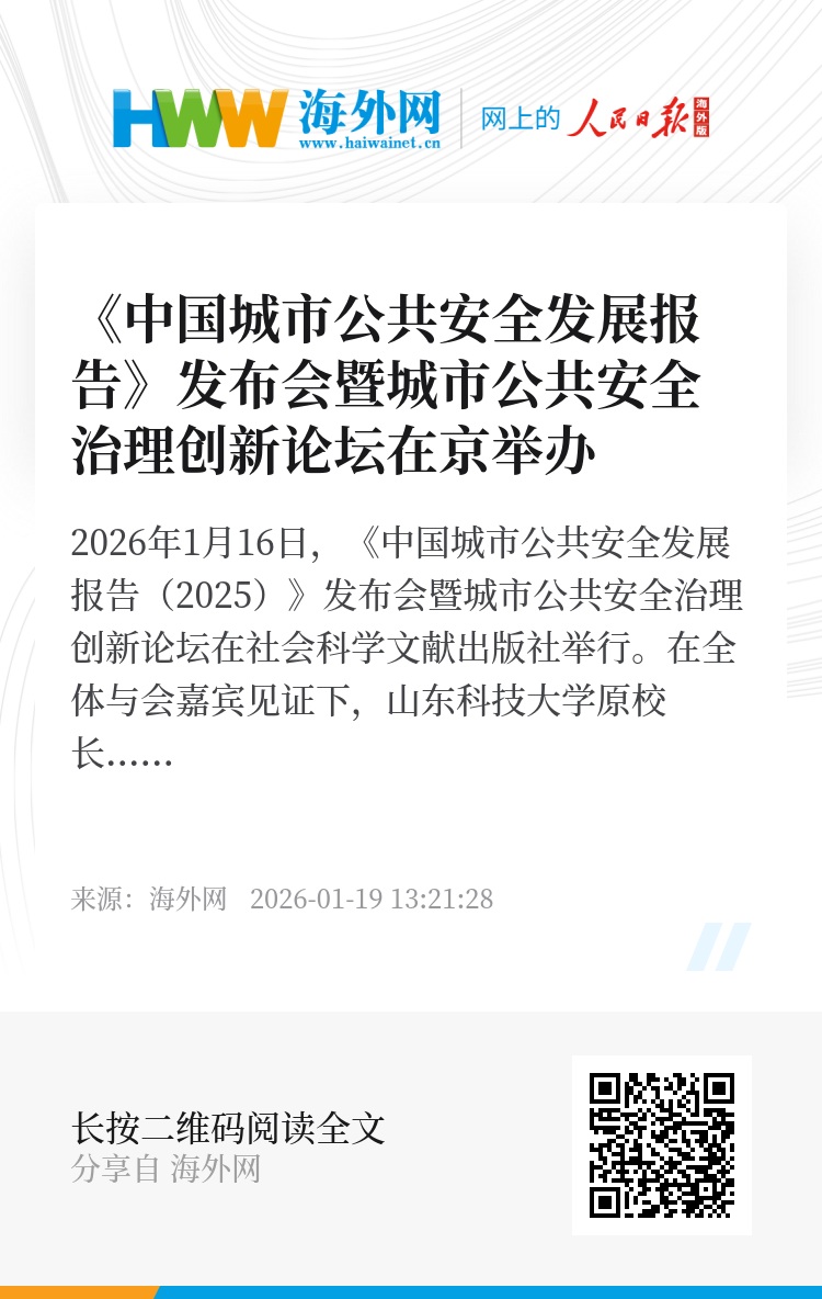 2026年1月16日,《中国城市公共安全发展报告(2025)》发布会暨城市公共安全治理创新论坛在社会科学文献出版社举行。
