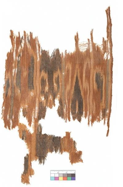 青海都兰热水墓群2018血渭一号墓出土的扎经染色织物实物图。