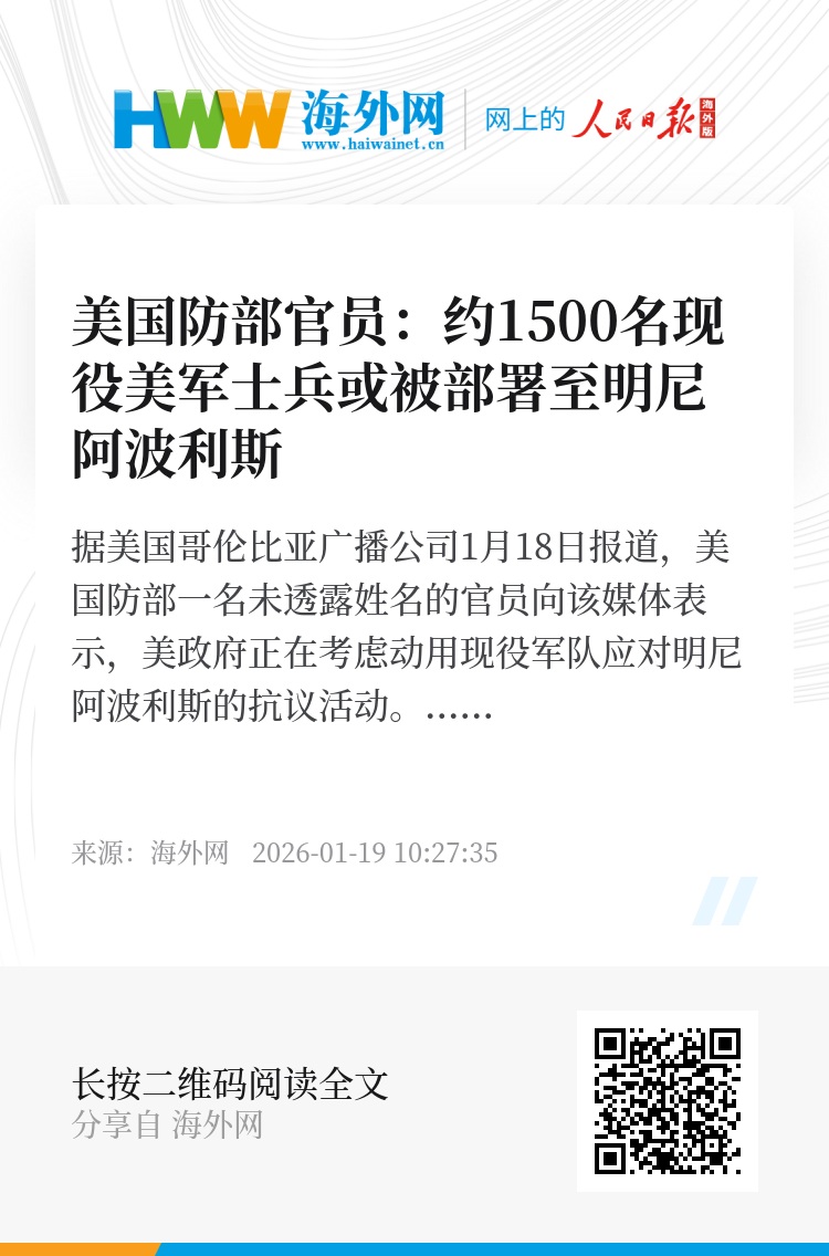 海外网1月19日电 据美国哥伦比亚广播公司1月18日报道,美国防部一名未透露姓名的官员向该媒体表示,美政府正在考虑动用现役军队应对明尼阿波利斯的抗议活动。