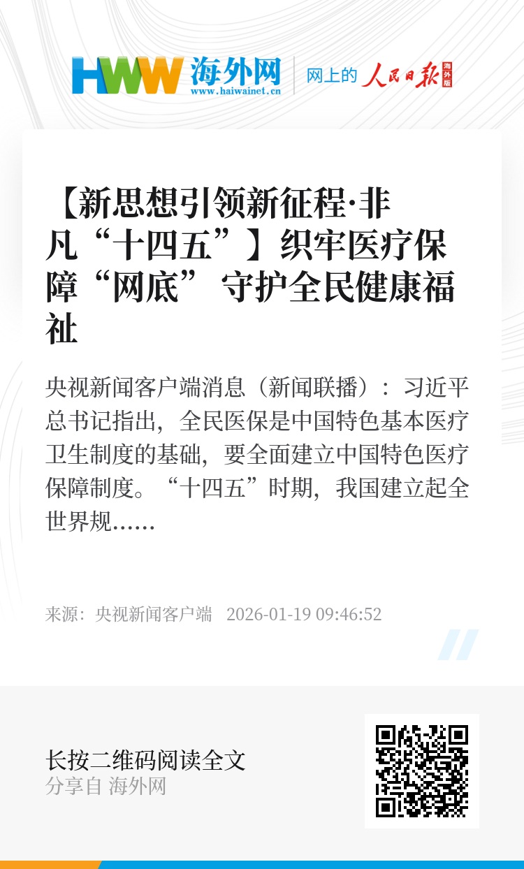 央视新闻客户端消息(新闻联播):习近平总书记指出,全民医保是中国特色基本医疗卫生制度的基础,要全面建立中国特色医疗保障制度。“十四五”时期,我国建立起全世界规模最大的医疗保障网,医疗保障制度日益健全,群众就医用药负担持续大幅减轻,全民健康水平显著提升。