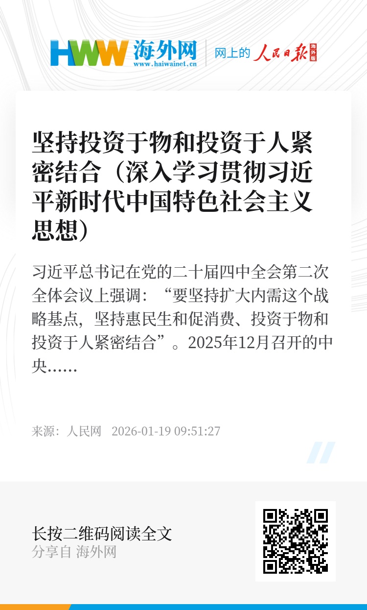 习近平总书记在党的二十届四中全会第二次全体会议上强调:“要坚持扩大内需这个战略基点,坚持惠民生和促消费、投资于物和投资于人紧密结合”。2025年12月召开的中央经济工作会议提出:“必须坚持投资于物和投资于人紧密结合”。坚持投资于物和投资于人紧密结合,立足中国式现代化全局,深刻把握经济社会发展规律,实现了发展方式从“物本优先”向“物人协同”的历史性转变,是新时代推进中国式现代化的战略举措,为“十五五”时期乃至更长阶段的发展提供了根本遵循,彰显了党在新时代发展理念的升华与投资实践路径的创新。我们要深刻认识投资于物和投资于人紧密结合的重要意义,准确把握其科学内涵和重要要求,积极探索有效路径,不断优化投资结构,加大投资于人的力度,强化制度供给,注重统筹协调,把投资于物和投资于人相互促进、协同发展贯穿于经济社会发展各领域全过程,为2035年基本实现社会主义现代化奠定坚实基础,奋力开创以中国式现代化全面推进强国建设、民族复兴伟业新局面。