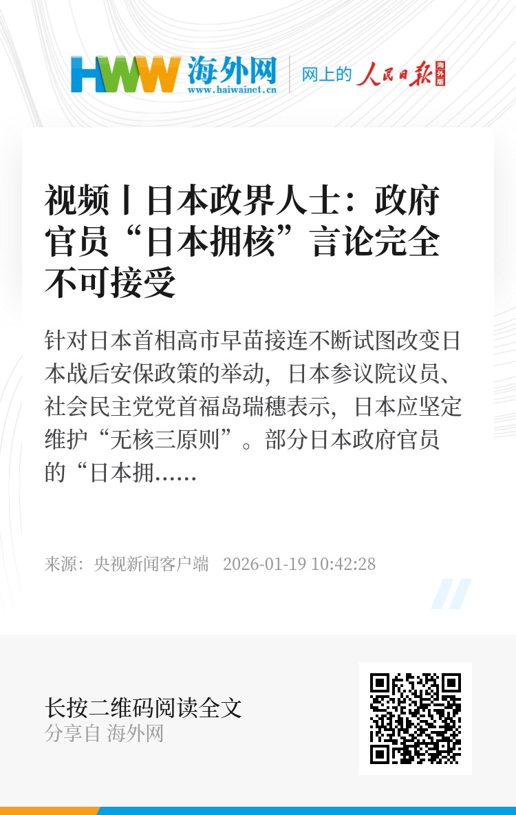 针对日本首相高市早苗接连不断试图改变日本战后安保政策的举动,日本参议院议员、社会民主党党首福岛瑞穗表示,日本应坚定维护“无核三原则”。部分日本政府官员的“日本拥核”言论是对该原则的严重挑战,完全不可接受。