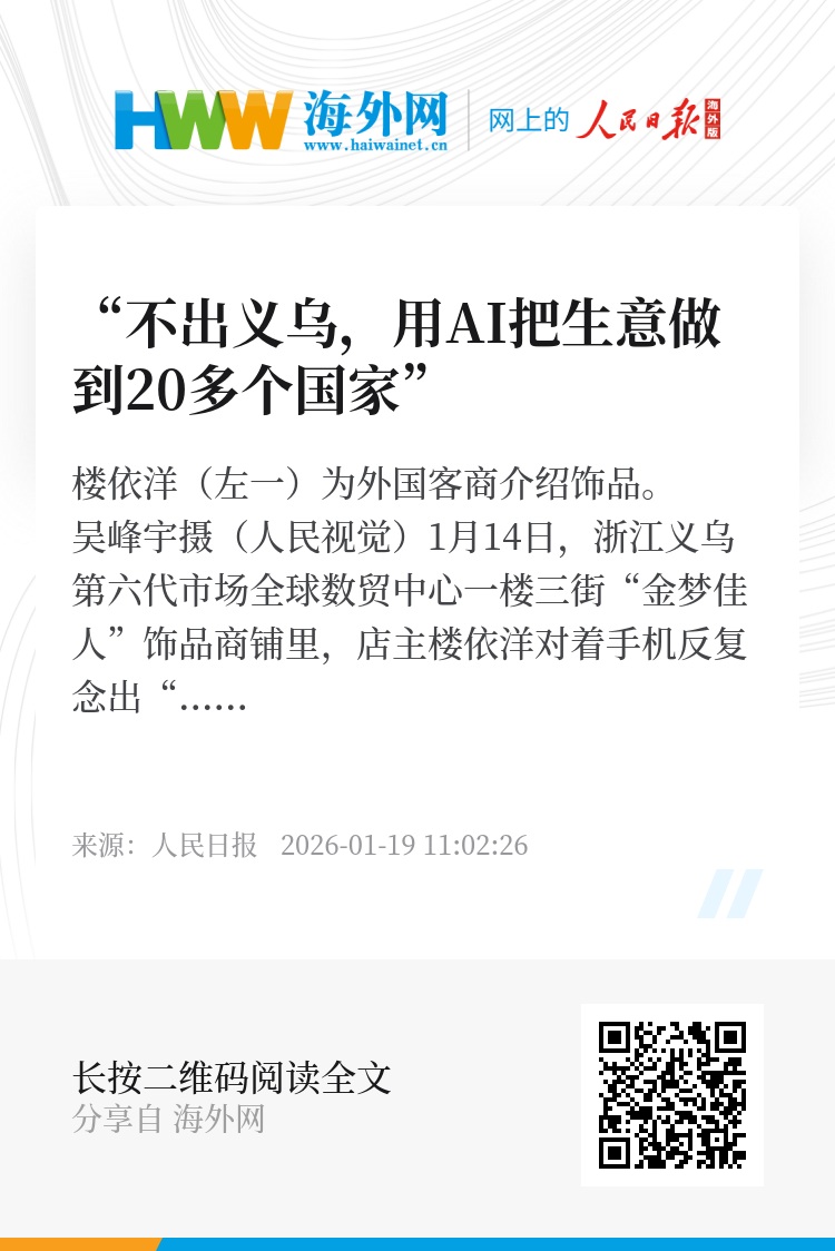 在义乌全球数贸中心,像楼依洋这样的年轻人正在成为数字智能化转型的主力军,与父辈“守店等客”不同,他们熟练运用AI工具,通过短视频、社交平台等渠道,打开了国际市场的新窗口。“世界义乌”商贸大模型,推出了六大功能板块、14项应用场景,全面赋能小商品贸易上下游全链路;目前平台注册用户超5.6万,累计调用量突破10亿次。