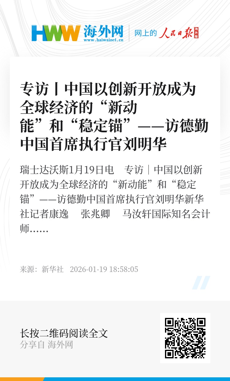 新华社瑞士达沃斯1月19日电 专访|中国以创新开放成为全球经济的“新动能”和“稳定锚”——访德勤中国首席执行官刘明华