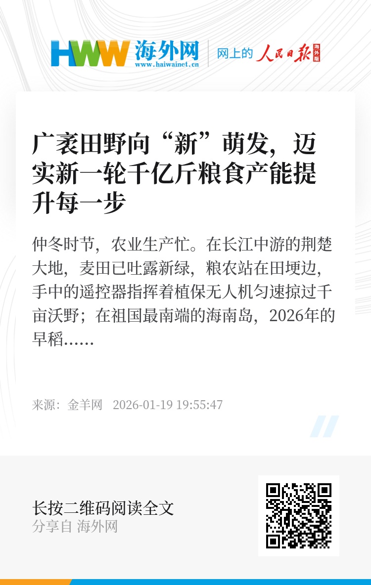 仲冬时节,农业生产忙。在长江中游的荆楚大地,麦田已吐露新绿,粮农站在田埂边,手中的遥控器指挥着植保无人机匀速掠过千亩沃野;在祖国最南端的海南岛,2026年的早稻插秧季已然启动,插秧机在田里划出整齐的轨迹,将新的希望栽种进温热的水土中;在江苏南京的实验室,全球首个地膜大语言模型“瑞雪”正在为千里之外的农田,精准计算着最环保的覆盖方案;而在西北边陲新疆柯坪县的戈壁滩上,数百座温室大棚整齐列阵,棚内“南果北种”的番茄苗长势正盛,设施农业释放戈壁生产潜力……新年新气象,广袤的田间地头一片忙碌景象,神州大地以实干开新局,描绘出“十五五”新征程上的三农壮丽奋斗图景。