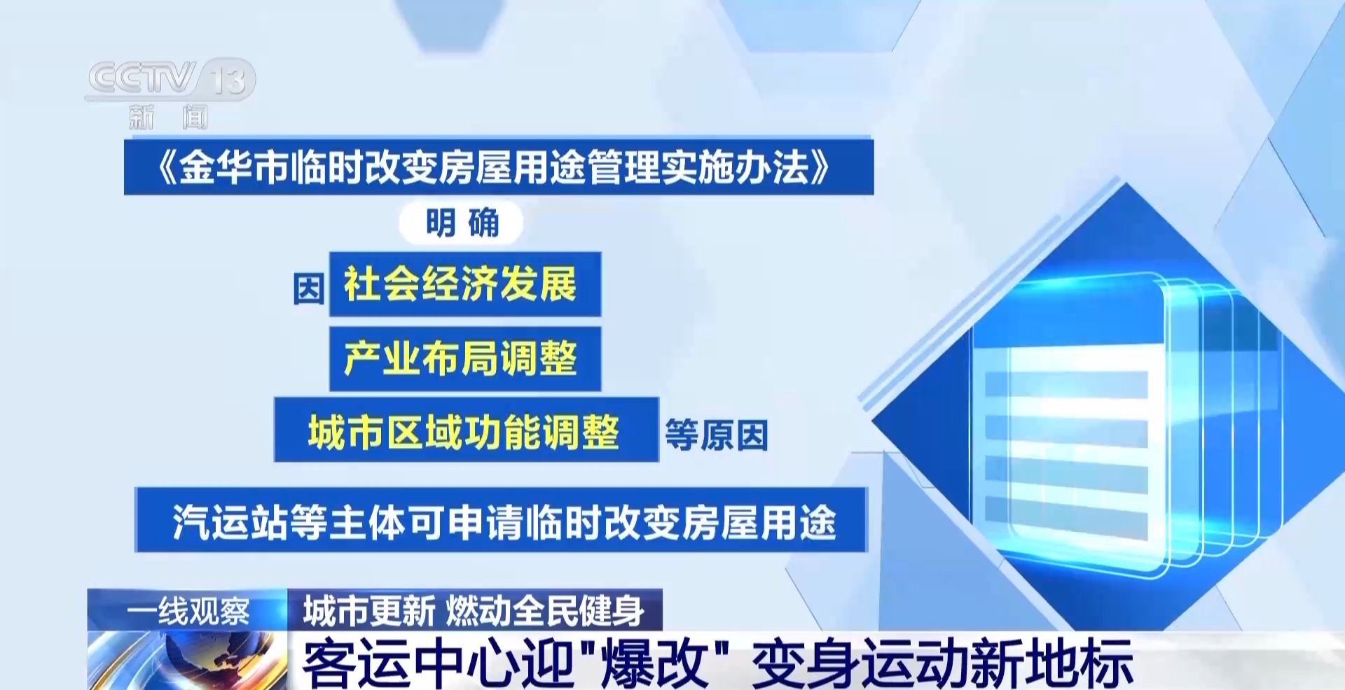 为破解城市更新中业态转型难题,金华市出台了临时改变房屋用途管理实施办法,明确因社会经济发展、产业布局调整、城市区域功能调整等原因,汽运站等主体可申请临时改变房屋用途。金华市汽车南站也成为首批受益的城市更新项目。