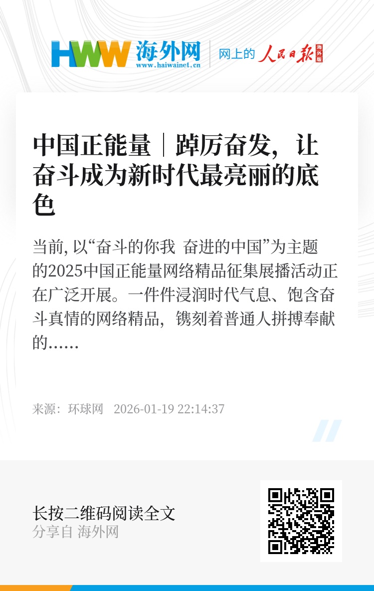 中国正能量,汇聚温暖人心、向上向善的精神力量。大国之大,亦有大国之重;千头万绪的事,说到底是千家万户的事。过去一年,新就业群体权益保障更加完善,适老化改造便利了老年生活,育儿家庭补贴切实减轻了负担……这些关乎“柴米油盐、三餐四季”的务实举措,让无数“小家”热气腾腾,也有力托举起中国这个“大家”的蒸蒸日上。网络空间是亿万民众的精神家园,也是凝聚人心、温润社会的重要阵地。2025中国正能量网络精品征集展播活动,牢牢把握“正能量是总要求”的原则,通过展播那些记录民生改善、展现百姓笑脸、讴歌奉献担当的优秀作品,在网络空间形成崇德向善、见贤思齐的强劲洪流,引导人们关注身边美好,践行社会主义核心价值观,将个体幸福的“小叙事”融入国家发展的“大洪流”,把“时代大流量”转化为推动社会进步、实现民族复兴的“最大增量”。
