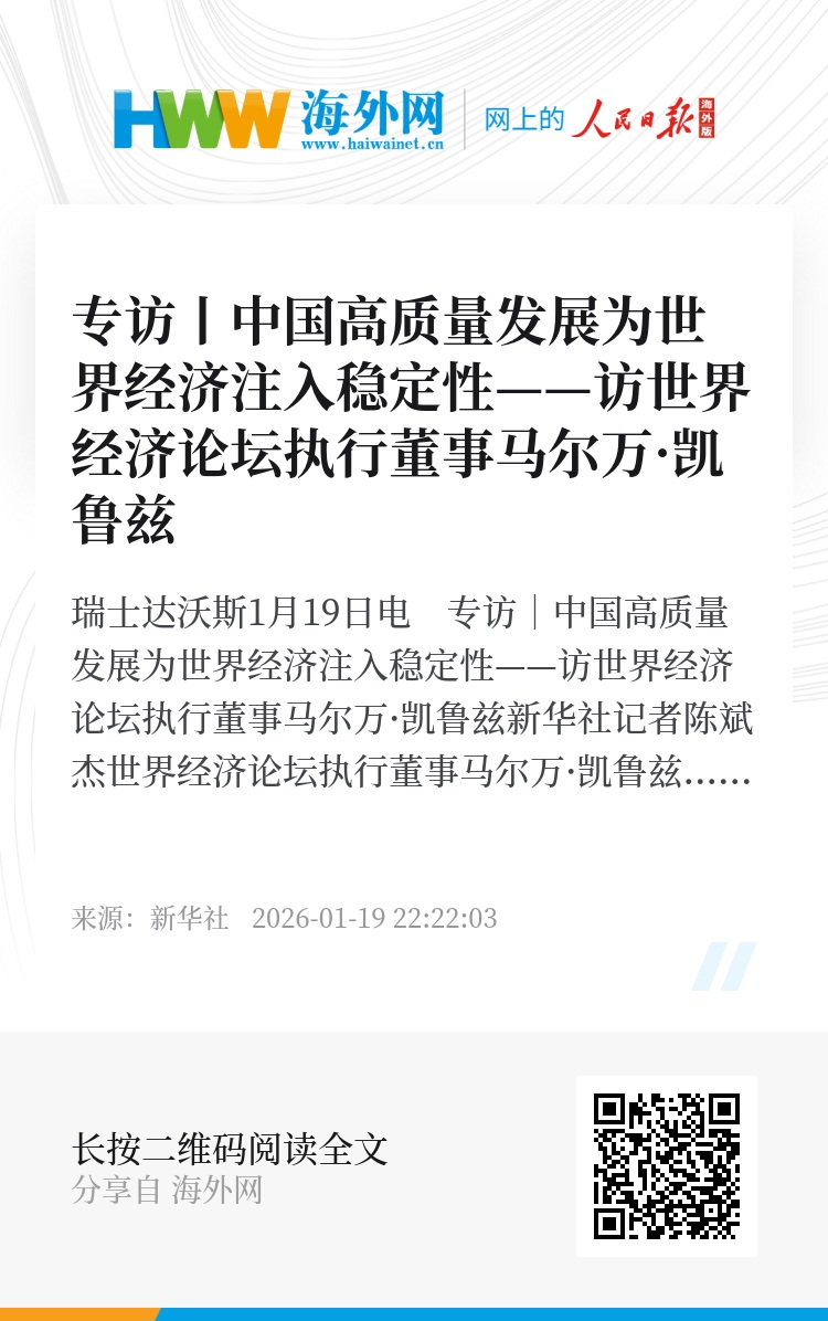 新华社瑞士达沃斯1月19日电 专访|中国高质量发展为世界经济注入稳定性——访世界经济论坛执行董事马尔万·凯鲁兹