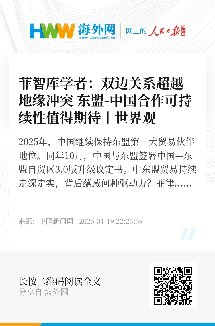 2025年,中国继续保持东盟第一大贸易伙伴地位。同年10月,中国与东盟签署中国—东盟自贸区3.0版升级议定书。中东盟贸易持续走深走实,背后蕴藏何种驱动力?菲律宾“亚洲世纪”战略研究所副所长安娜·罗萨里奥·马多林格·乌伊(Anna Rosario Malindog-Uy)据此观察称,东盟与中国的长期良好伙伴关系,实质上反映了双方在经济结构上,超越地缘政治层面的深度依存。而这种合作可持续性仍需双方共同发挥协同作用。(记者 薛凌桥)