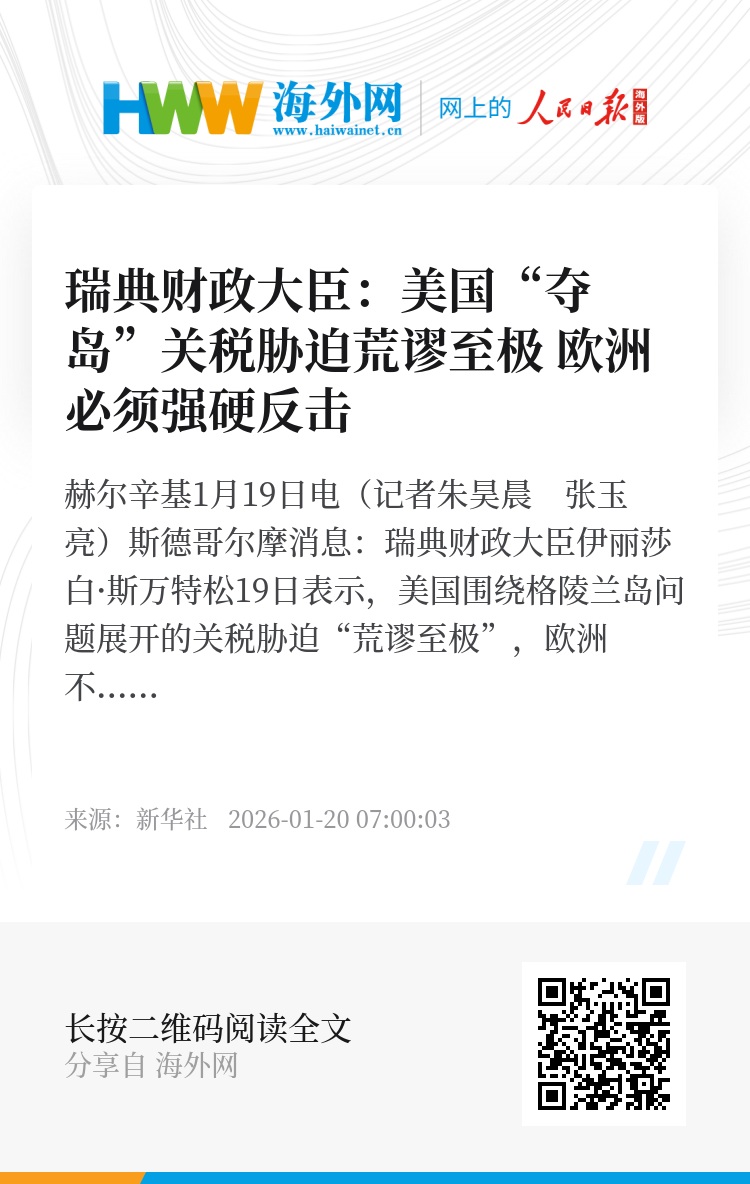 斯万特松19日接受瑞典电视台采访时说,美国总统特朗普试图用加征关税的方式迫使格陵兰岛落入美国之手,这一举动“荒谬至极”,“如同儿戏”。