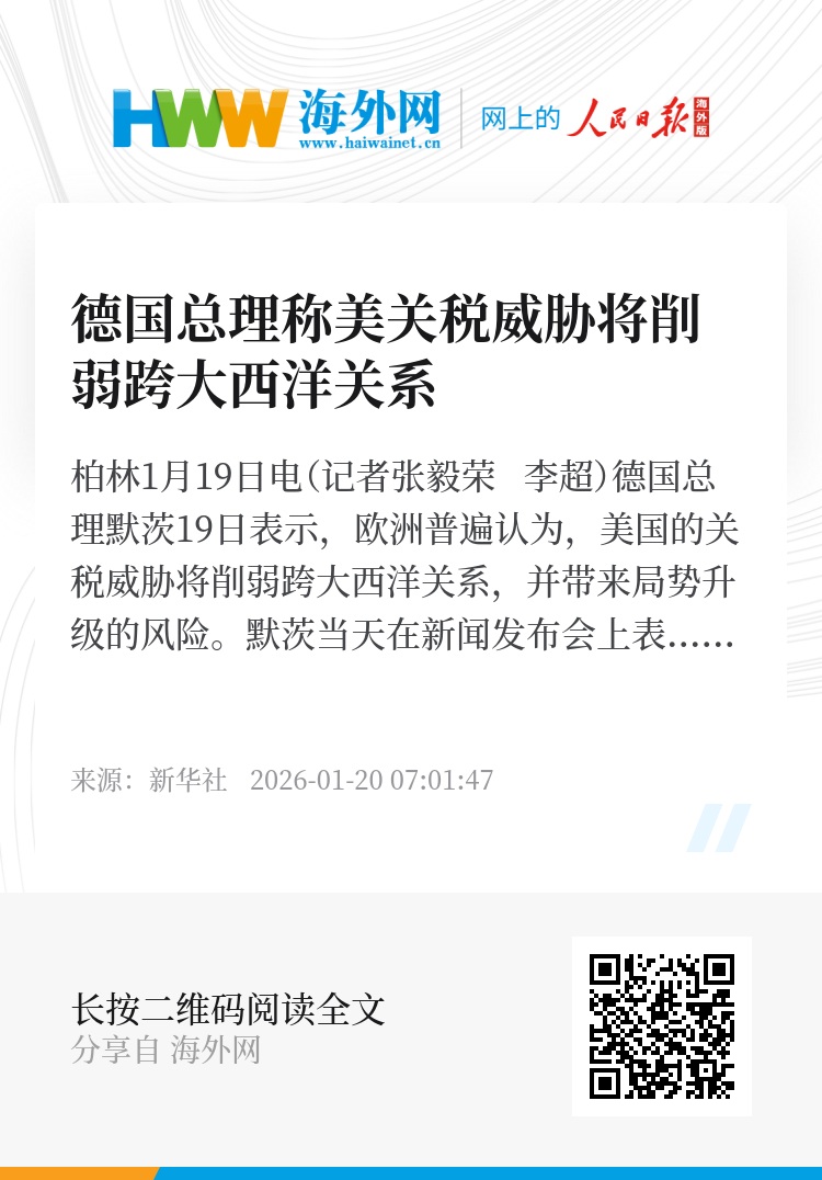 新华社柏林1月19日电(记者张毅荣 李超)德国总理默茨19日表示,欧洲普遍认为,美国的关税威胁将削弱跨大西洋关系,并带来局势升级的风险。