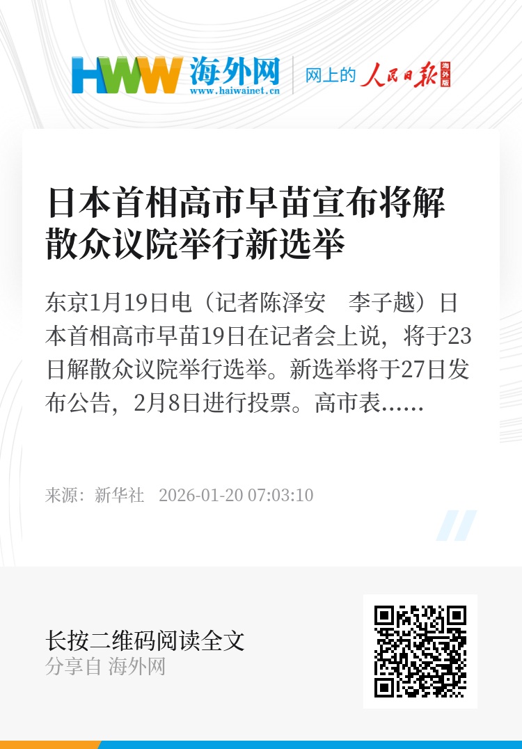 新华社东京1月19日电(记者陈泽安 李子越)日本首相高市早苗19日在记者会上说,将于23日解散众议院举行选举。新选举将于27日发布公告,2月8日进行投票。