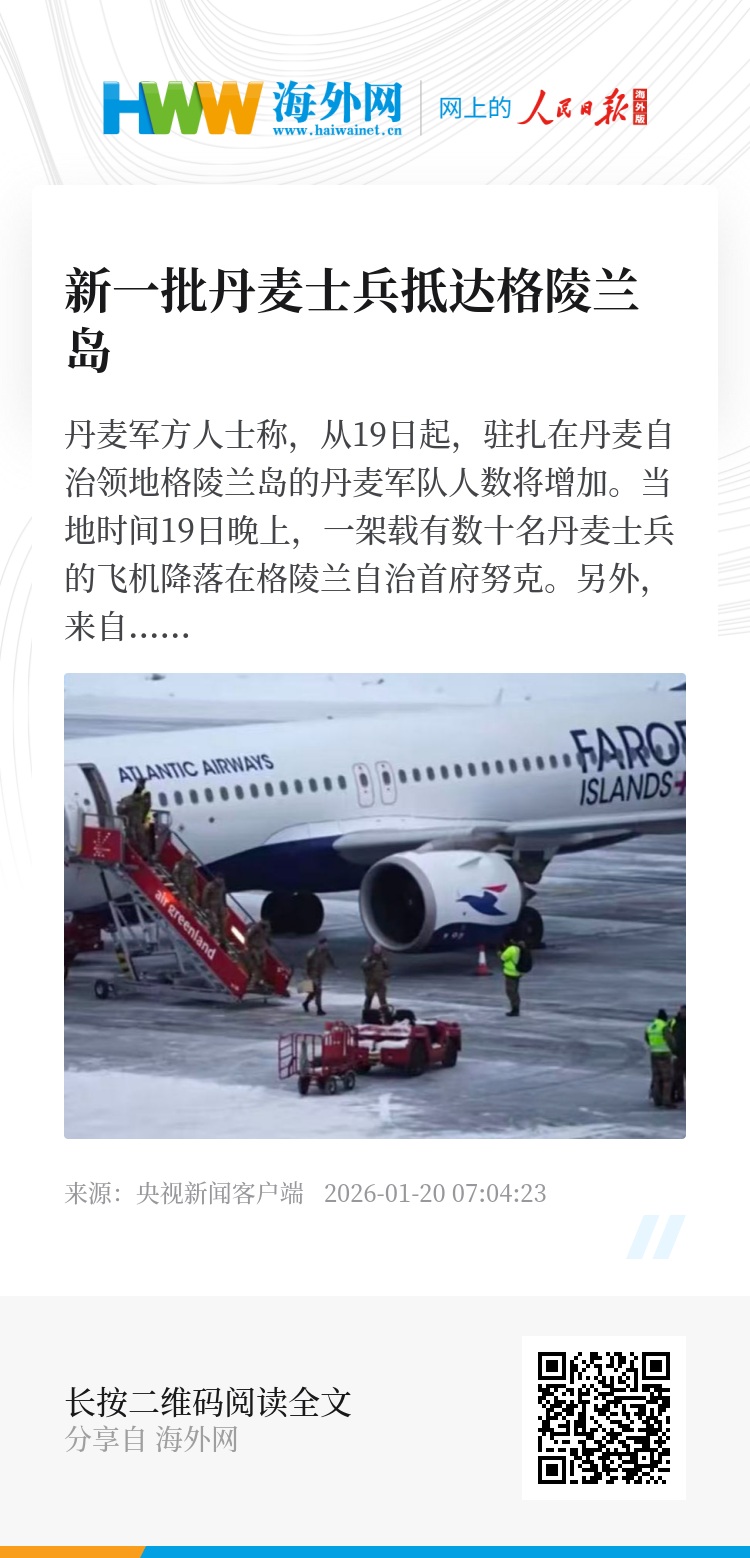 丹麦军方人士称,从19日起,驻扎在丹麦自治领地格陵兰岛的丹麦军队人数将增加。当地时间19日晚上,一架载有数十名丹麦士兵的飞机降落在格陵兰自治首府努克。另外,来自丹麦陆军第一旅大约58名士兵同一天也抵达格陵兰岛的康克鲁斯瓦格。