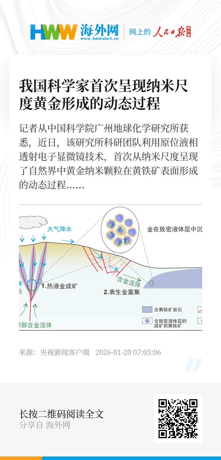 本次研究发现挑战了“金主要源自深部热液流体”的传统观点,为阐释自然界中纳米颗粒驱动的矿化过程开辟了新路径。从应用角度看,该机制对绿色浸金工艺中的界面调控具有指导意义。(总台央视记者 帅俊全 褚尔嘉)