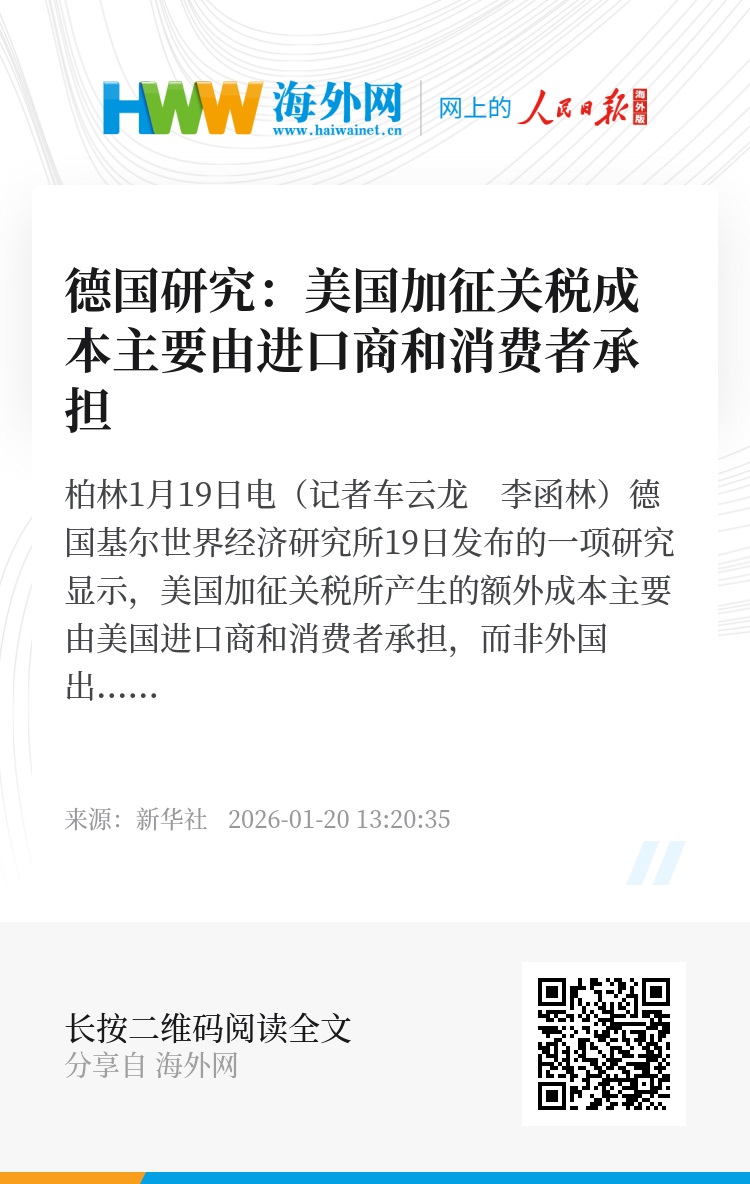 新华社柏林1月19日电(记者车云龙 李函林)德国基尔世界经济研究所19日发布的一项研究显示,美国加征关税所产生的额外成本主要由美国进口商和消费者承担,而非外国出口商。研究指出,这一结果与美国政府有关“关税由外国出口商承担”的说法不符。