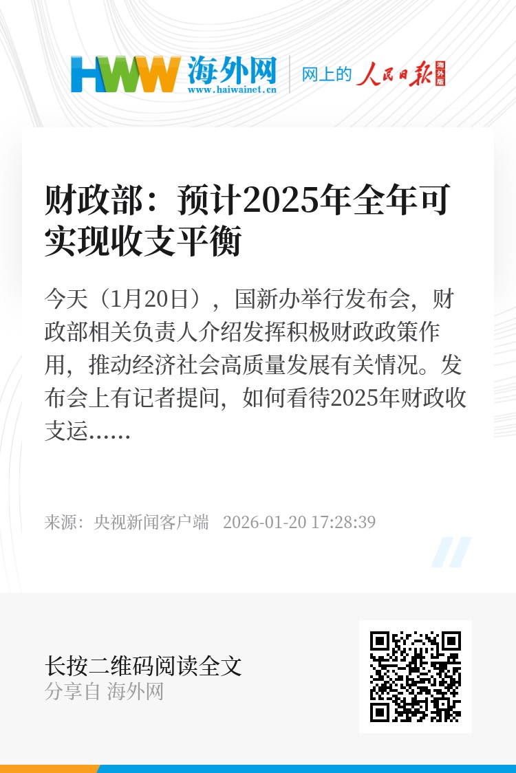 今天(1月20日),国新办举行发布会,财政部相关负责人介绍发挥积极财政政策作用,推动经济社会高质量发展有关情况。发布会上有记者提问,如何看待2025年财政收支运行情况,是否完成了年初的预算目标?