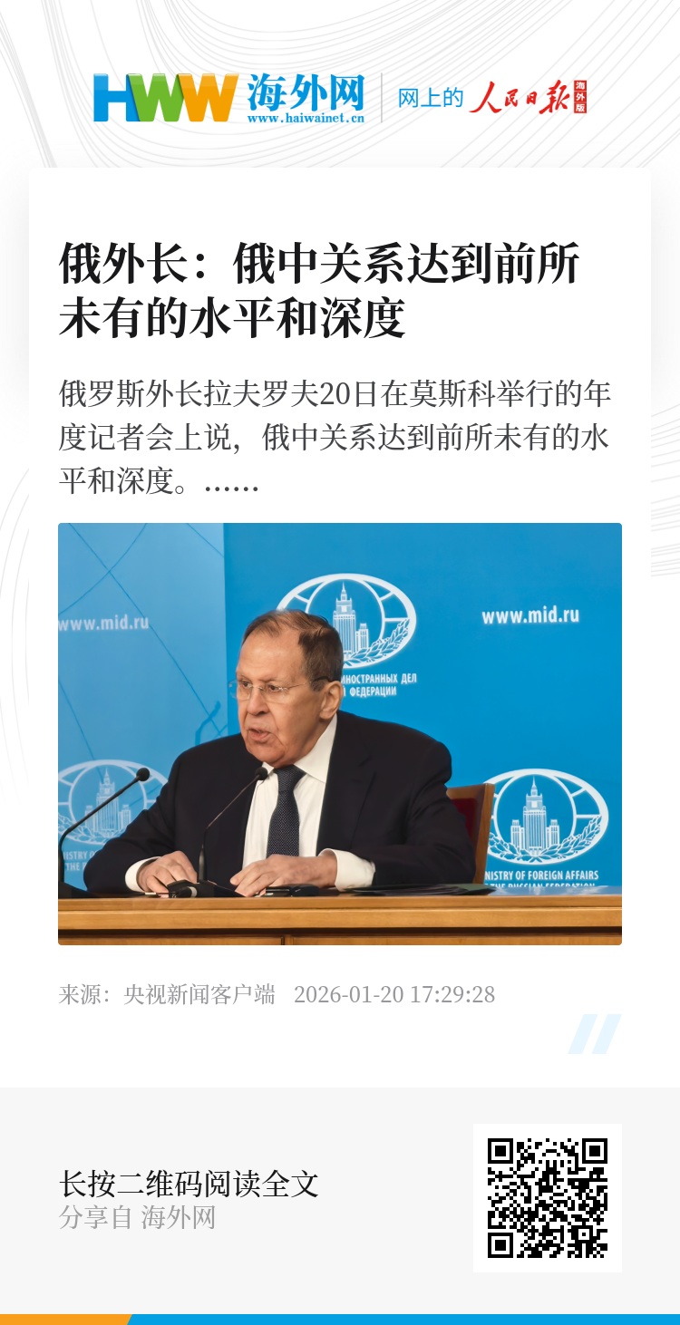 俄罗斯外长拉夫罗夫20日在莫斯科举行的年度记者会上说,俄中关系达到前所未有的水平和深度。
