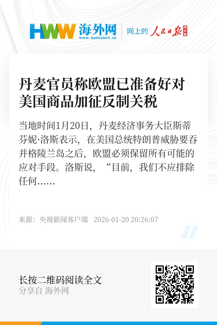 洛斯表示,欧盟现在普遍认为,格陵兰岛问题不仅仅关乎丹麦,而是关乎整个欧洲与美国的关系。洛斯称,尽管欧盟国家在丹麦和格陵兰到问题上采取了一致行动,但美国方面似乎并没有缓和局势。(总台记者 康玉斌)